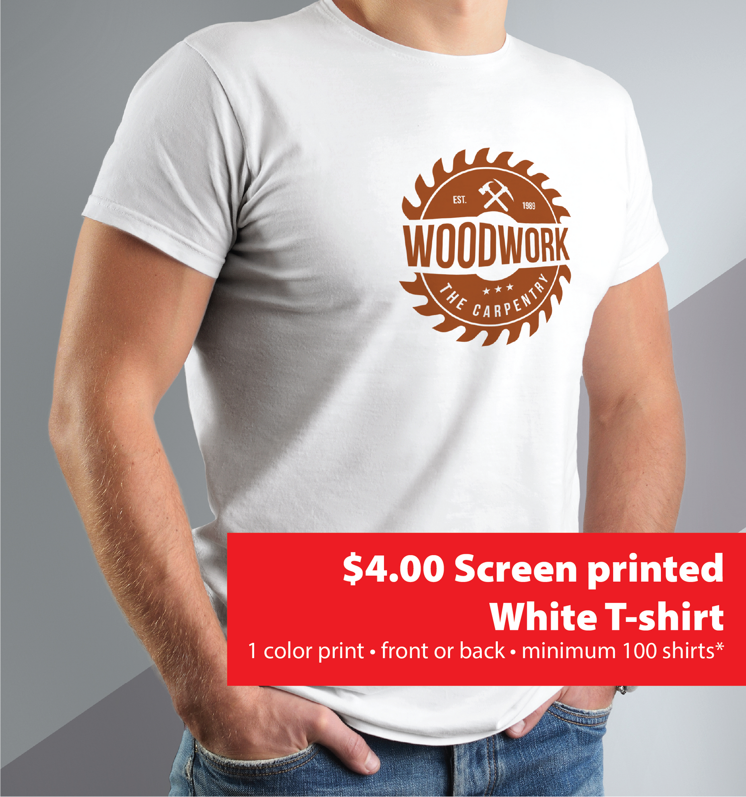 Exclusive : $4.00 deal on 1-color imprinted white T-shirt. Choice of front or back print. Minimum order of 100 units. Email us for more information or to cash in on this deal. Be sure to mention the code BLUEKAI4 to receive this deal.